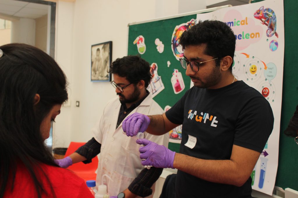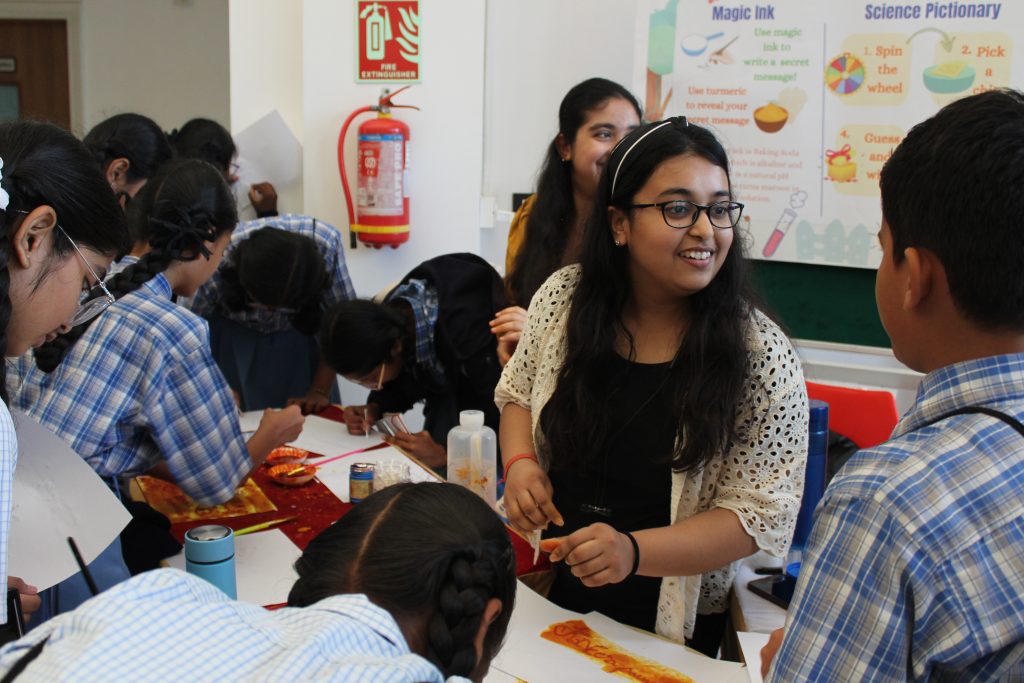 Students wrote hidden messages using baking soda solution and revealed them with turmeric solution, demonstrating acid-base indicators. A science-themed Pictionary activity encouraged students to communicate scientific ideas through illustration.